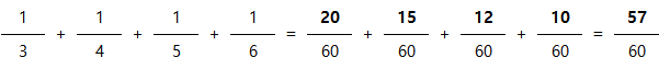 3,4,5,6의 최소공배수 60을 기준으로 계산하면 1/3이 20, 1/4가 15, 1/5가 12, 1/6이 10 이므로 값들을 더하면 57입니다.