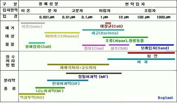 나노여과 (nano-filtration, NF), 역삼투 (Reverse osmosis, RO) 등으로 구분됩니다.