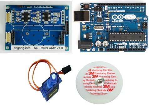 SG-Power_AMP와 ARDUINO UNO 그리고 SG-90 서보모터와 생체측정패드입니다.