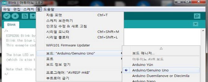 메뉴에서 [툴] ▶ [보드] ▶ [Arduino Uno] 선택 (처음 한번 세팅되면 다음부터는생략)