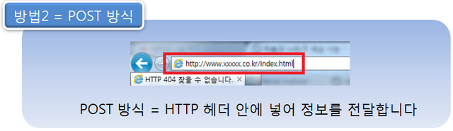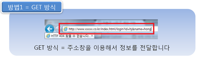 - GET : 주소창에 정보를 노출시키는 방식 (URL에 변수를 포함시켜 요청)