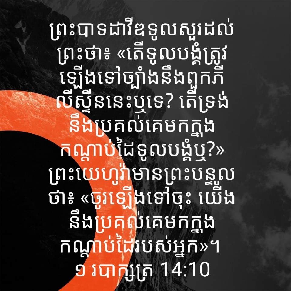so David inquired of God: "Shall I go and attack the Philistines? Will you hand them over to me?" The LORD answered him, "Go, I will hand them over to you. (1 Chronicles 14:10) ดาวิดก็ทรงทูลถามพระเจ้าว่า “ควรที่ข้าพระองค์จะขึ้นไปต่อสู้พวกฟีลิสเตียหรือ? พระองค์จะทรงมอบพวกเขาไว้ในมือของข้าพระองค์หรือ?” และพระยาห์เวห์ตรัสตอบพระองค์ว่า “จงขึ้นไป และเราจะมอบพวกเขาไว้ในมือเจ้า (1 พงศาวดาร 14:10) Đa-vít cầu-vấn Đức Chúa Trời rằng: Tôi phải đi lên đánh dân Phi-li-tin chăng? Chúa sẽ phó chúng nó vào tay tôi chăng? Đức Giê-hô-va đáp lời cùng người rằng: Hãy đi lên; ta sẽ phó chúng nó vào tay ngươi. (I Sử-ký 14:10) 다윗이 하나님께 물어 이르되 내가 블레셋 사람들을 치러 올라가리이까 주께서 그들을 내 손에 넘기시겠나이까 하니 여호와께서 그에게 이르시되 올라가라 내가 그들을 네 손에 넘기리라 하신지라 (역대상 14장 10)