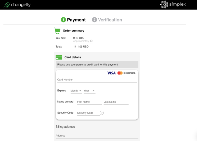 먼저, 결제정보를 입력하십시오.명목화폐 관련된 모든 거래는 파트너인 Simplex를 통해 처리되므로, 페이지에 로고가 표시되더라도 놀라지 마십시오.