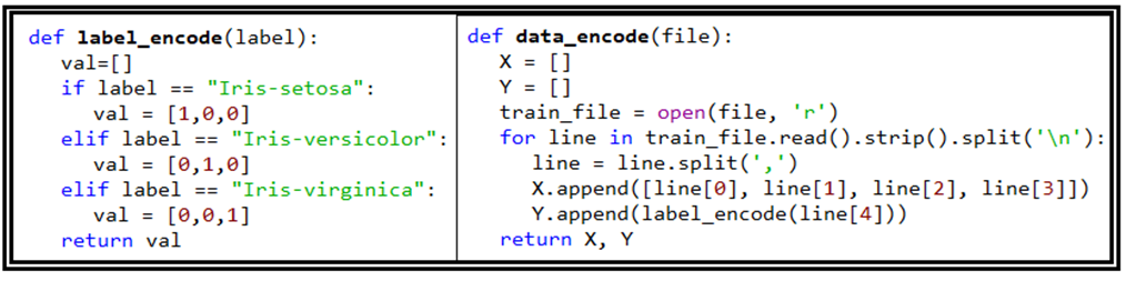 함수 label_encode() 와 data_encode()를 정의 한다. data_encode()는 데이터 파일을 넘겨주면 읽기용으로 오픈하여 줄바꿈(‘\n’) 기준으로 라인 데이터를 읽어 들여서 ‘,’ 를 기준으로 데이터를 분리하여 line[0], line[1], line[2], line[3], line[4]에 각각의 값을 입력한다. 한편 label_encode() 는 넘겨받게 되는 데이터가 문자열 종류가 ‘Iris-setosa’ , ‘Iris-versicolor’, ‘Iris-virginica’ 인지를 따져서 그에 대응하는 one hot code를 데이터를 넘겨주게 된다. 이는 TensorFlow에서 Softmax 명령 사용을 위해서 필요한 데이터 준비 작업이다.