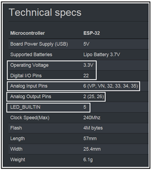 WeMos LOLIN D32의 규격을 살펴보자. PC와 USB 케이블 연결을 통해 5V를 공급 받지만 내부의 사용 전압은 WeMos D1R 과 마찬가지로 3.3V를 사용하며 모든 I/O 핀들도 3.3V를 사용해야 한다. 아울러 리튬폴리머 배터리 연결 커넥터를 제공하므로 3.7∼4.2V 드론용 500mA 리튬배터리 사용이 가능하다.
