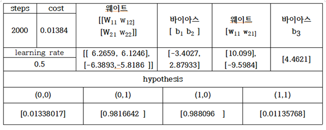 코드 실행을 통해 제대로 된 결과 즉 Correct: [[0.] [1.] [1.] [0.]] 이 얻어진 경우를 대상으로 다음과 같이 표로 정리하였다.