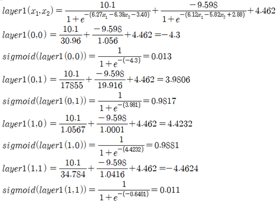 위에 주어진 결과표를 사용하여 이 2개의 수식을 다음과 같이 정리하고 4개의 입력 데이터 [0.0],[1,0],[0,1],[1,1]에 대하여 수계산을 해 본 결과 xor_nn_01.py 코드에 의한 계산 결과와 잘 일치함을 확인할 수 있다.