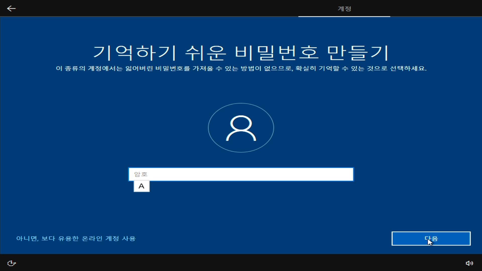 마이크로소프트 계정으로 로그인 하는 부분인데 저는 이부분에서 오프라인 계정으로 로그인을 합니다. 그냥 예전 방식이라고 생각 하시면 될 것입니다.