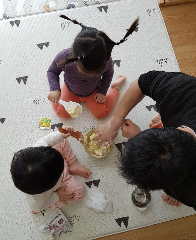 호떡믹스를 놓치지 않겠다는 일념 하에 마치 고지를 점령이라도 하듯 달려드는 두 녀석을 가까스로 따돌리고 설거지 통에 모든 것을 던져 넣었죠...