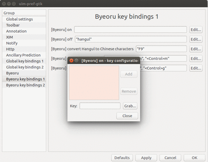Byeoru key bindings 1으로 들어가서 [Byeoru] on, off에 "hangul"이 설정되어 있지 않다면 아래와 같이 설정합니다. (Edit -> 아래의 빈 입력창이나 Grab을 누르고 키보드의 한글 버튼 누르기 -> Add)