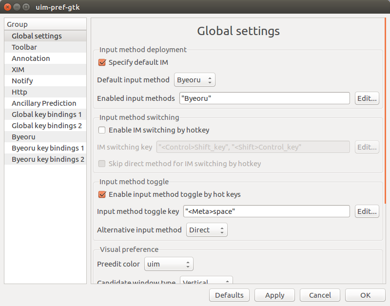아래에 설명할 방법은 "uim" 또는 "fcitx"를 이용해서 설정하는 방법입니다. 우선 아래의 내용을 기본으로 하겠습니다.