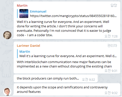 A: 체인간통신(interblockchain)을 통해 기존(existing) 체인을 방해하지 않고, 새로운 체인에 새로운 주요 기능을 구현(implemented)할 수 있음. 블록 프로듀서는 새로운 기능이 구현된 체인과 기존 체인을 간단히 구동할 수 있음. 그것은 기능에 대한 범위(scope)와 파급 효과(ramifications) 그리고 논쟁(controversy)에 따라 달라질 수 있음.
