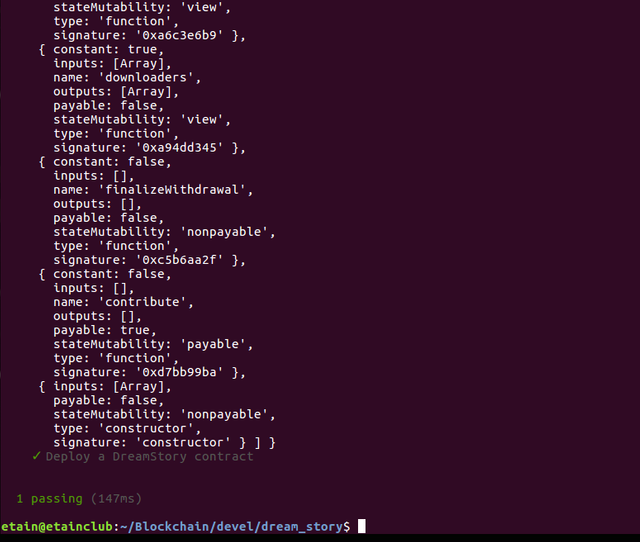 그러면 아래와 같이 테스트가 패스하고, deploy된 컨트랙트 객체의 내용들이 출력됩니다. 테스트를 실행 후 약간의 시간이 걸리는게 느껴지나요? 로컬 네트워크이라고 해도 컨트랙트 객체를 deploy하라는 트랜잭션을 전송하는데 시간이 소요됩니다. 메인 네트워크라면 더 많은 시간이 걸릴 수 있겠죠.