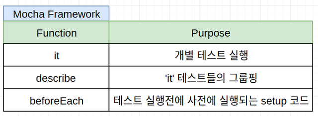 Mocha라는 테스트 framework이 있습니다. 여기서는 스마트 컨트랙트의 기능들을 테스트 하기 위해서 Mocha를 사용합니다. Mocha에서 주로 사용하는 함수와 목적은 아래와 같습니다. 저도 Mocha를 처음사용하지만, 개념적으로 보면 구글 C++ unnitest의 Test, Fixture와 유사합니다.