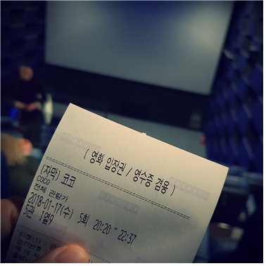 전체관람가 영화이고, 디즈니의 영화라.. 늦은 시간임에도 불구하고 꼬맹이 관람객들이 좀 들어왔습니다. 중간에 한번 난감하면서도 휴~하고 한숨이 나오는... 진짜 코코가 시작하는 장면 즈음에서 아이들이 쨍알쨍알 난리가 났었습니다. 아이고.. 이것들아 조용히 좀 하자.. 라고 속으로 투덜거리는 저 였지만... 그 아이들의 옆에 앉은 엄마 아빠들은.. 소중하고 사랑스러운 가족이겠죠.