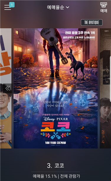 현재 예매율 3위를 기록하고 있는 코코입니다. 왼쪽 상단에 동그라미 ①.. 저도 예매했음을 알려주네요.