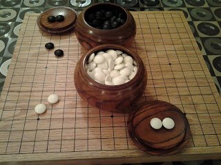 Black and white stones are used and they are usually placed in wooden or plastic Go bowls.