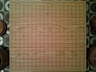 Go is typically played on a wooden board of 19 x 19 lines (a Goban), like this: