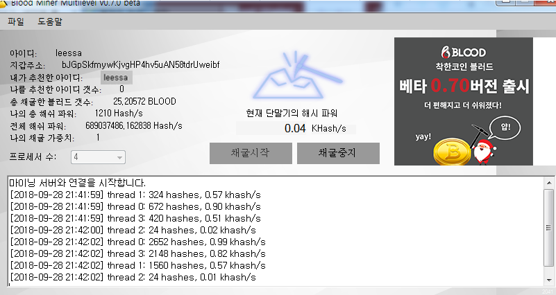 블러드코인을 얻기위해 채굴 및 구매를 해야하는데, 구매는 장외로 해서 1개당 0.3원 정도