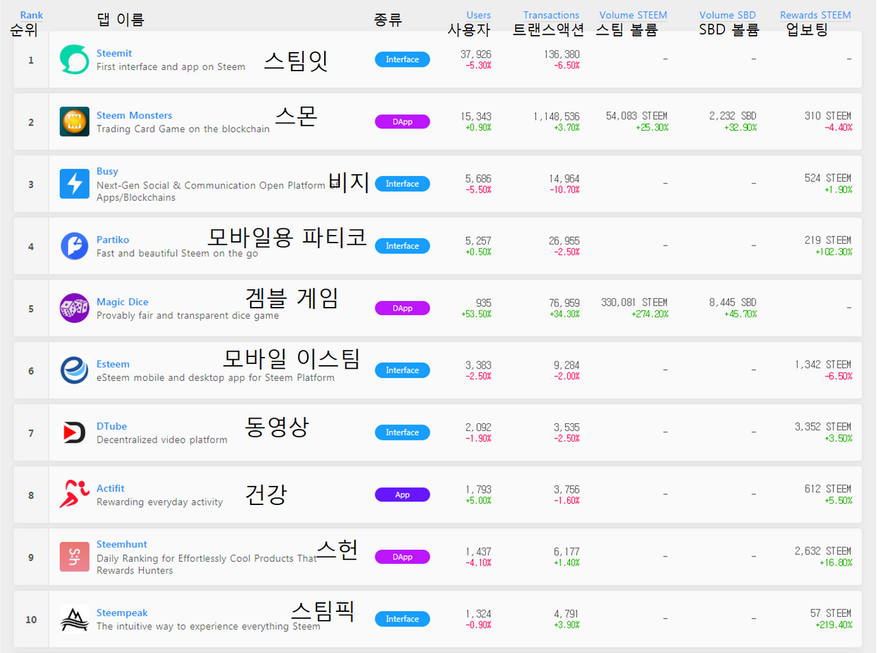 하기 스샷은 state of the dapps에서 우선 스팀만 따로 정리했는데, 우리의 댑들이 열일 하고 있네요.