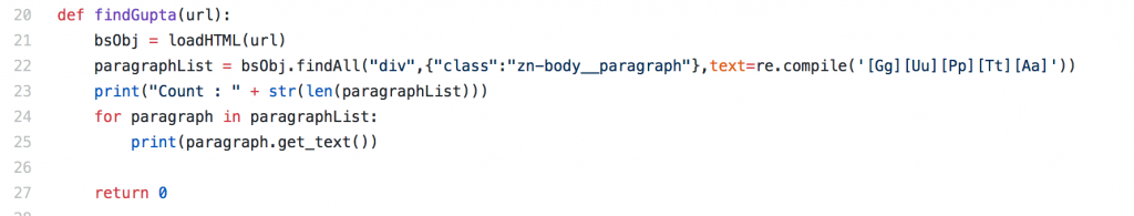 시작은 위에 적었던 CNN10의 첫 페이지(소스를 보면 address 변수로 정의됨)를 읽고, 찾은 규칙에 따라 각 아카이브를 적어둔 태그(span 태그, class이름이 cd__headline-text라고 attribute가 설정되어있다)를 찾고, 그 각 아카이브들을 for-loop를 통해 다시 'gupta' 라는 단어를 찾기 위해 find_gupta라는 함수로 각 아카이브의 주소를 넘기게 된다.