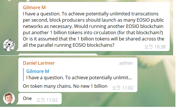 질문이 있는데요. 초당 무제한의 거래가 가능하려면, 블록 제작자(BP)는 필요한 만큼 많은 EOSIO 공개 체인(public networks)을 런칭해야 합니다. 다른 EOSIO 블록체인을 실행하면, 10 억 개의 새로운 토큰이 새 블록체인에서 생성(into circulation)되는 것인가? 또는 10 억 개의 EOS 토큰이 병렬로 실행되는 모든 EOSIO 블록체인에서 공유(shared)되나요?