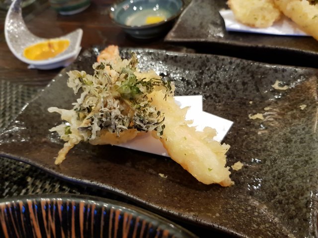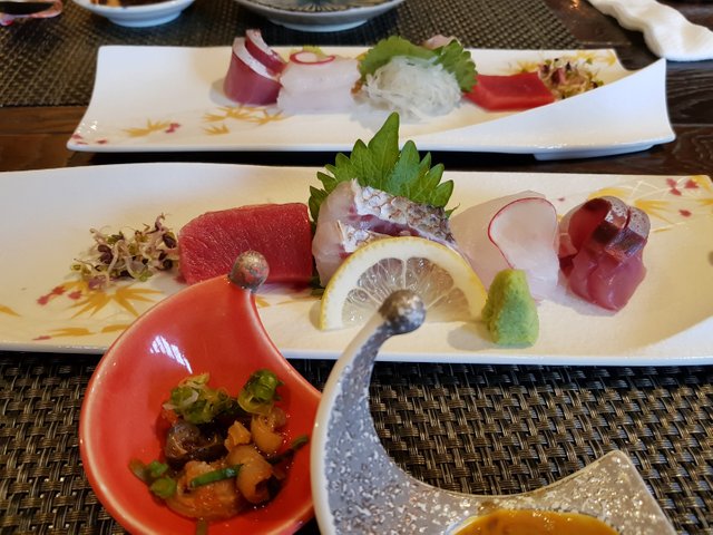다음으로 사시미가 나왔습니다. 사시미는 방어 광어 껍닥도미 참치 적신 이 나오는데 썰림의 정도나 맛이 일품이었습니다. 껍딱도미는 사실 처음먹어보는데 껍질 특유의 질감이 있었습니다. 이걸 좋아하시는 분은 굉장히 좋아하는고급 회 중에 하나인데 식감이 제 입맛에는 별로 맞지 않았습니다.