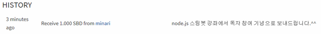 - amount: 송금할 금액의 표시입니다. '1.000 SBD'와 같이 소수점 세째자리와 단위가 포함된 문자열을 입력합니다. 단위까지 함께 넣는걸 몰라서 한참 해맸던 기억이 나네요 ^^