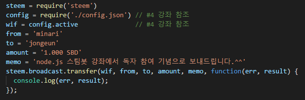 [node.js 스팀봇 강좌] #6. steem.js를 이용하여 송금하기