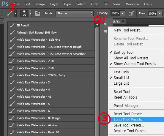 - 카일 브러쉬 로드하실 땐, Load Tool Presets으로 해야 합니다. 순서대로 하시고요.