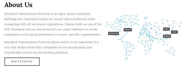 STP는 Standard Tokenization Protocol 줄임말로 규정을 준수하여 토큰을 발행하는 프로토콜입니다. STP는 글로벌 컨설팅 기업 Block72가 개발, 발행하였습니다. STP는 법적/자문적인 테두리를 제공함과 동시에 프로그래밍 가능한 실시간 정산 기능을 제공합니다.
