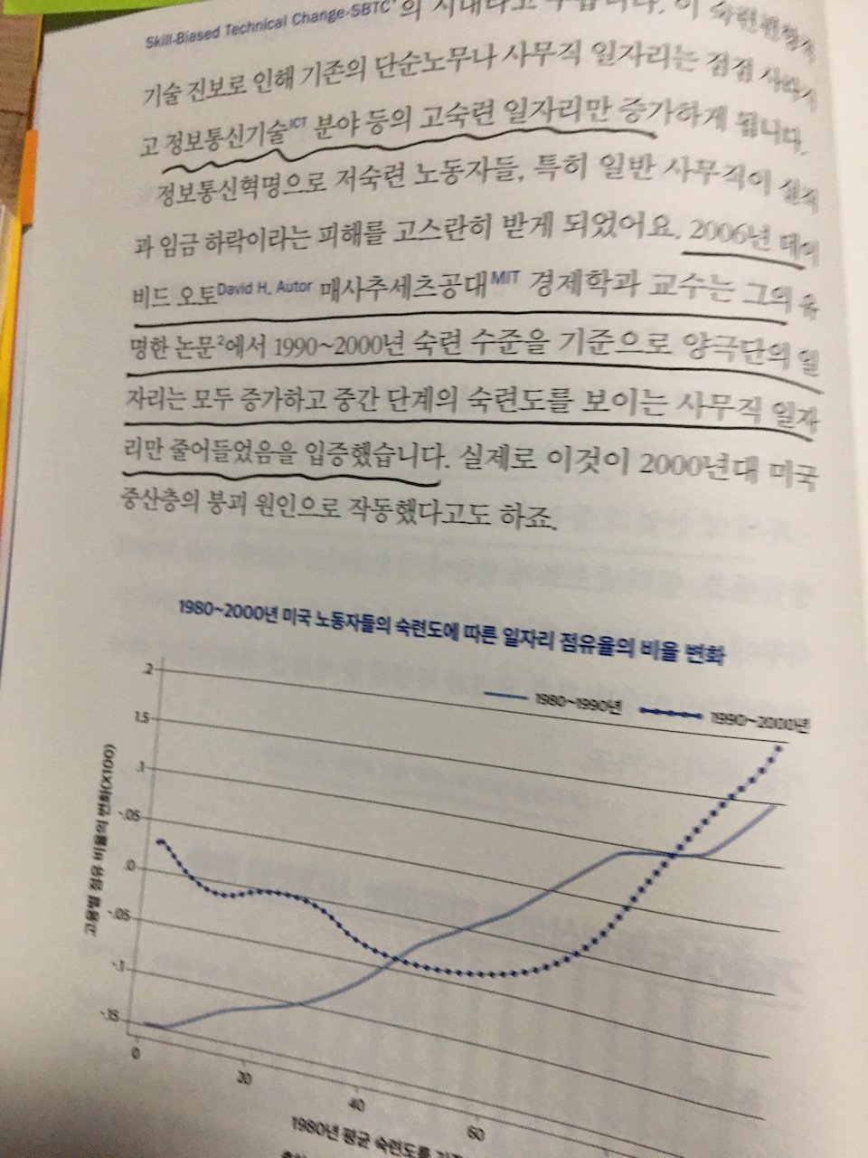이 숙련편향적 기술 진보로 인해 기존의 단순노무나 사무직 일자리는 점점 사라지고 정보통신기술 분야 등의 고숙련 일자리만 증가하게 됩니다.