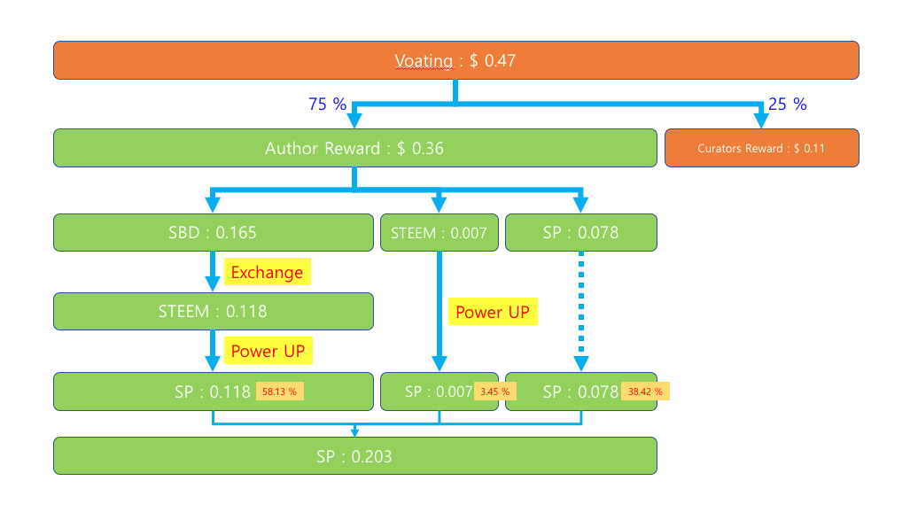 - 글에 보팅된 금액이 $1일때 저자 보상받은 것들을 스팀파워로 전환하면 대략 0.432 정도 된다.