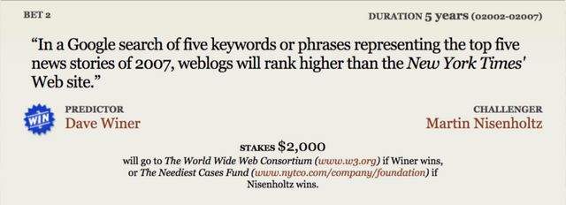 롱 베츠의 내기는 보통 수백 달러 내지 수천 달러 정도입니다. 2007년까지, 가장 큰 내기는 커즈와일-케이포의 투어링 테스트 내기였습니다. 그런 이후 워런 버핏이 등장합니다.