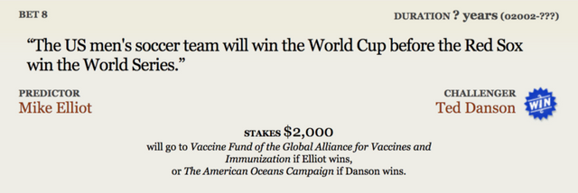 롱 베츠의 내기 중 첫 번째 승자는 배우이자 레드 삭스의 열혈 팬인 테드 댄슨이었습니다. 2002년, 타임지의 편집자 마이클 엘리엇은 레드 삭스가 월드 시리즈에서 우승하는 것보다 미국 남자 축구팀이 월드컵에서 우승하는 것이 더 빠를 것이라는데 1,000달러를 걸었습니다.