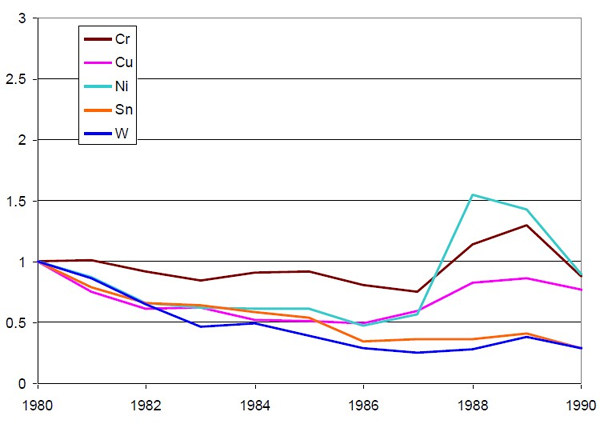 보다 최근인 1980년 생물학자이자 환경주의자 파울 에들리히가 경제학자 줄리안 사이먼과 내기를 벌었습니다. 에들리히는 다섯 가지 금속(구리, 크롬, 니켈, 주석 및 텅스텐)의 가격이 10년 동안 상승한다는데 10,000달러를 걸었습니다. 이들 금속 가격은 급락했고, 사이먼이 내기에서 이겼습니다.