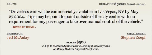 사람들은 다음 주말 경마 결과보다 더 먼 미래에 일어날 일을 놓고 사람들과 내기를 겁니다. 현재 피터 슈워츠는 헌터 로빈스와 전기 자동차가 언제 표준이 될지, 즉 10년 내지 20년일지, 아니면 15년 내지 25년 일지를 놓고 내기를 벌이고 있습니다.