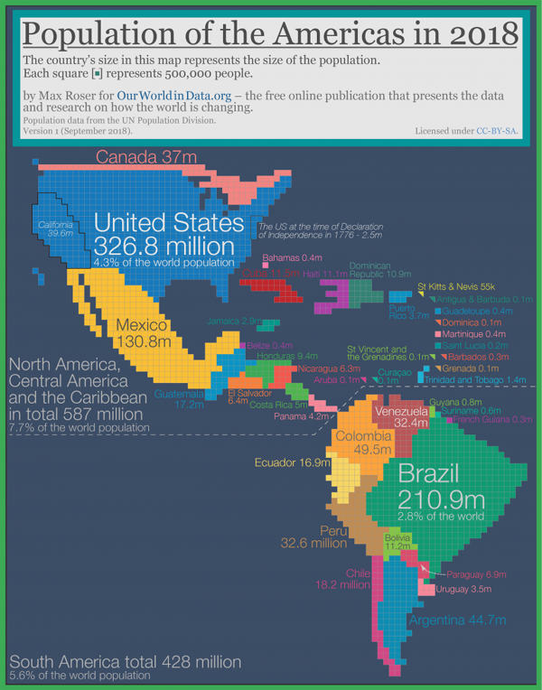 남아메리카 나라들의 모습은 지리 지도에 나와 있는 것과 흡사합니다. 남아메리카 여러 나라들의 인구 밀도가 비교적 비슷하기 때문입니다.