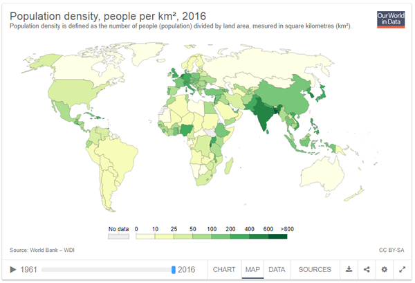 인류가 주로 어디에 살고 있는 보여주는 또 다른 지도는 아래 나타낸 지리 지도에 인구 밀도를 더한 것입니다. 세계에서 인구 밀도가 높은 나라는 중앙아메리카, 유럽 및 동남아시아에 두드러져 있습니다. 방글라데시는 세계에서 가장 인구 밀도가 높은 나라로, 제곱킬로미터 당 1,252명이 살고 있습니다.