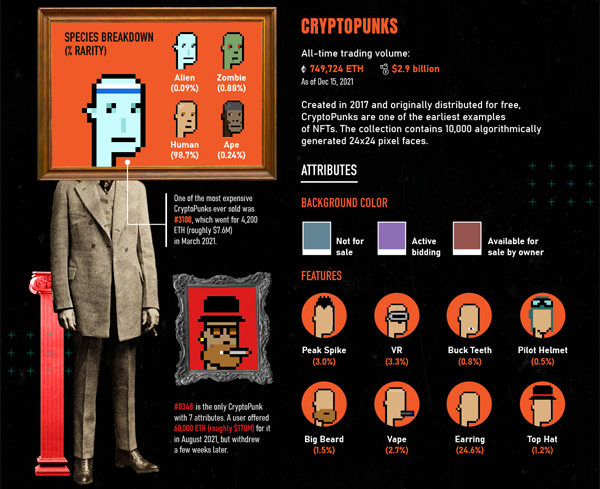 크립토펑크는 일반적으로 NFT의 첫 번째 사례 중 하나로 간주된다. 이 컬렉션은 10,000개의 독특한 "펑크"로 구성되어 있으며, 2017년 라바 랩스(Larva Labs)가 출시했다.