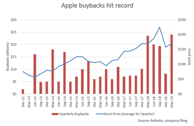 애플 역시 역사상 최대 금액을 주주들에게 돌려줬다. 2014년부터 2018년까지 애플은 2,230억 달러 상당의 자사주를 매입했고, 이는 S&P 500에서 18위인 홈 데포의 시가총액 보다 많은 규모였다.