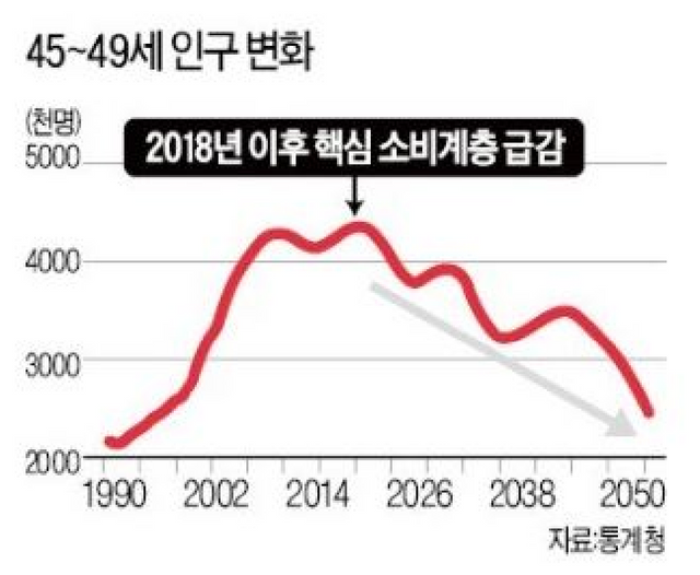 위 그림은 2018년 이후 핵심소비계층(45~49세)의 인구변화를 나타내는 그래프이다. 2018년을 기점으로 핵심소비계층이 2050년까지 지속적으로 하향되는 모습을 확인할 수 있다.
