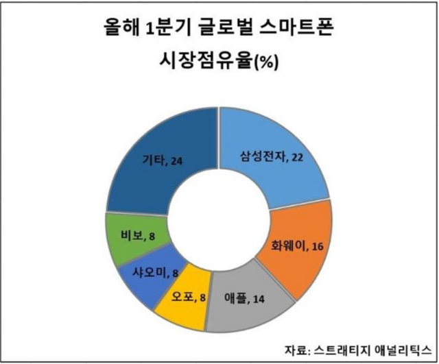 위 그림은 참고용이며 올해 1분기 Global 스마트폰 시장점유율을 나타낸다.