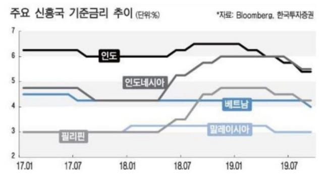 다. 그래서 오는 10월에는 관련한 영향을 집중적으로 점검해 통화정책의 추가완화 기조여부를 결정할 예정이다. 한편 인도네시아 중앙은행은 기준금리인 7일물 역환매조건부채권금리를 25bp(basis point) 낮춘 5.25%로 결정한다. 이는 美中무역마찰 심화 등 대외불확실성에 대응한 경기부양 차원의 조치이다.