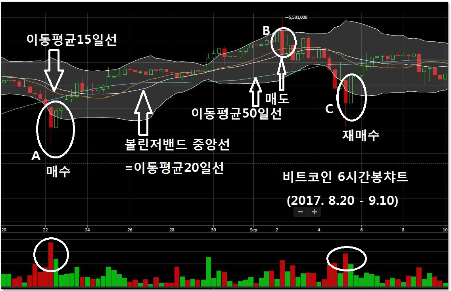 위 그림은 비트코인 6시간봉챠트(2017. 8. 20 - 9.10)입니다. 동그라미 A에서는 매수하고 동그라미 B에서는 매도하고 그 매도한 금액(굳이 자금을 추가 투입할 필요가 없음)으로 동그라미 C에서 다시 매수합니다. 주로 동그라미 A부분에 치중해서 설명하고자 합니다.