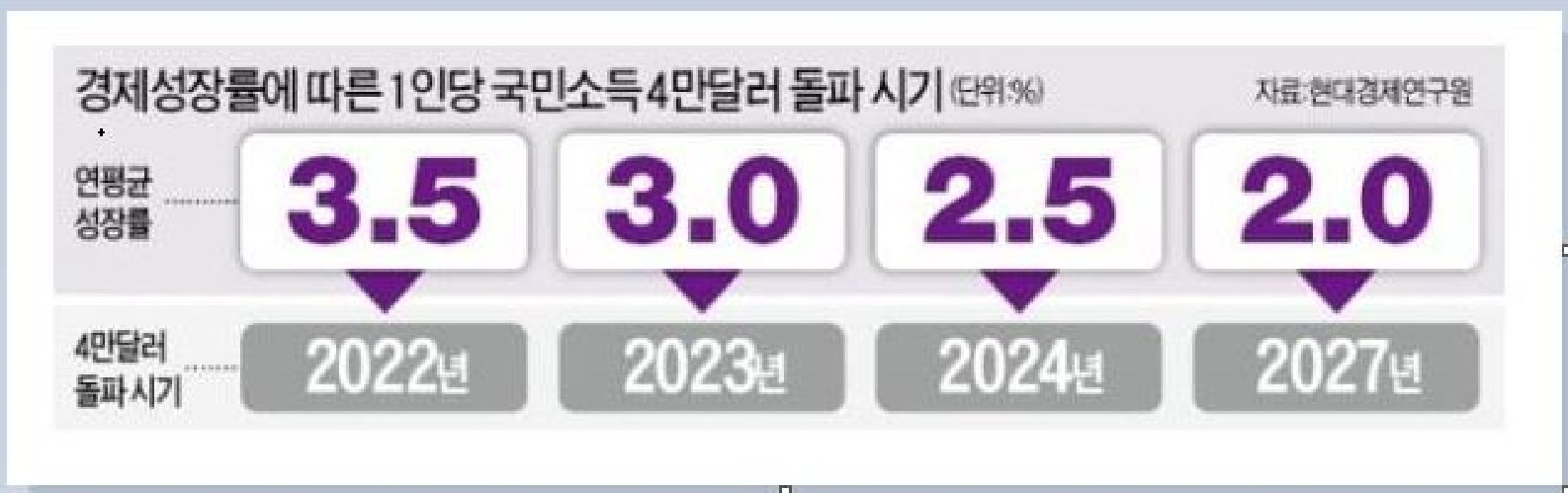 위 도표에 의하면 한국의 1인당 국민소득(GNI)은 3.5% 경제성장률을 유지할 경우 4년 뒤인 2022년 4만$를 넘어설 것으로 전망되고 있다. 이어 한국경제의 연평균 경제성장률이 △3%이면 2023년 △2.5% 2024년 △2%이면 2027년에 4만$를 넘을 것이란 분석이다. 국내 경제성장률(GDP)이 2%로 낮아지면 시기는 2027년으로 5년 늦춰진다. 선진국들이 3만$에서 4만$시대로 가는 데 걸린 기간(평균 4.9년)과 비교하면 속도(빠르기)면에서 비슷하다.
