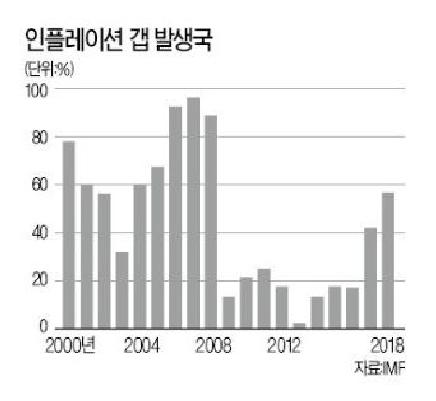 위 그림은 2000년부터 2018년까지의 매년 인플레이션 갭이 발생한 국가들을 백분비로 나타낸 막대그래프이다. 2018년에는 인플레이션 갭 발생국이 50%가 넘어선 것과 2008년 금융위기 이전과 당시에는 80%가 멈은 것을 위 그림을 통해 알 수 있습니다.