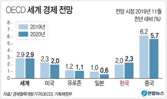 위 그림에서 보듯이 OECD 즉 경제협력개발기구는 올해 세계경제의 GDP성장률 전망을 2.9%로 유지한다. 그리고 내년도 전망은 기존 3.0%에서 0.1% 내린 2.9%, 2021년은 3.0%이다. 전기(前記)한 세계경제의 성장률 전망치는 세계 금