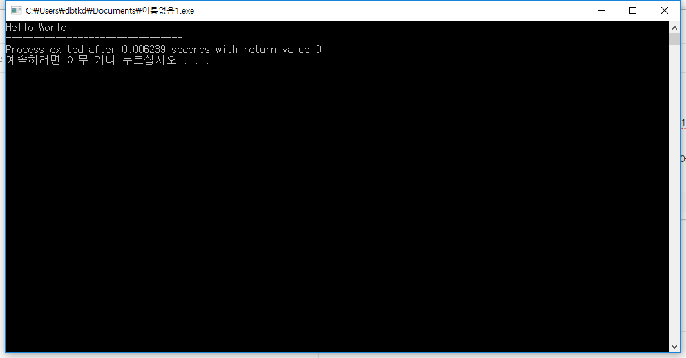 이런식으로 시커먼 창에 "Hello Wolrd"라고 출력이 되는 것을 확인할수 있습니다