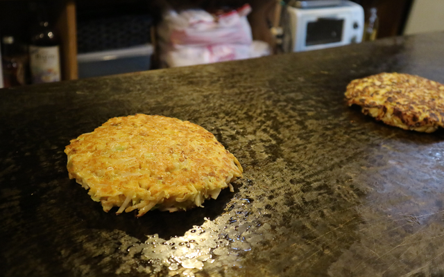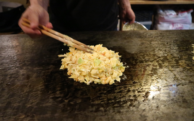 생맥주로 목을 축이고 있을때쯤 주인아저씨로 보이는 분이 다찌앞에 놓인 넓은 철판위에 기름칠을 한 후 오코노미야끼 반죽을 손바닥보다 좀 더 크게 놓고 나서 무심하게 다듬어 주시기 시작했다.